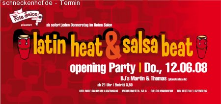 Unter dem Motto \"Latin Heat and the Salsa Beat\" startet am 12. Juni die neue donnerstags Salsa Party in Mannheim. Als neue Location präsentieren Euch DJ Martin und DJ Thomas das bekannte Lagerhaus.Frisch renoviert und mit neuen Namen versehen findet dort ab dem 12.Juni jede Woche die \"Latin Heat & Salsa Beat\" Party statt.Partybeginn 21 Uhr.Kostenlose Parkplätze und S-Bahnhaltestelle (fährt die ganze Nacht) direkt vor der Tür. Eintritt 3,50 Euro. Bilder der Location könnt Ihr Euch unter www.derrotesalon.net anschauen - Adresse: \"DER ROTE SALON\" im Lagerhaus | Industriestraße 53a | 68169 Mannheim