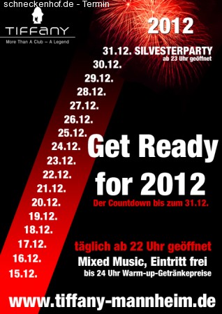 Das Jahr 2011 neigt sich langsam dem Ende. Es war ein ereignisreiches Jahr. Unser Kultclub bekam ein neues Design. Grund genug den Countdown einzuläuten! "Get ready for 2012" heisst es deswegen ab dem 15.12.2011. TÄGLICH ab 22 Uhr haben wir unsere Türen geöffnet. Schau vorbei und genieße kühle Drinks an unseren Bars, tanz zu besten Clubsounds und Classics und mach dich bereit für 2012.
